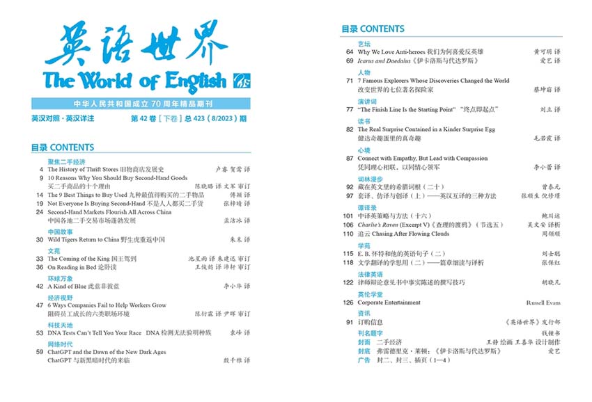 《英语世界》创刊于1981年,该刊是一本面向大学师生及英语爱好者的阅读学习类刊物。该刊宗旨是文拓视野、译悦心灵。常设重点栏目包括:文苑、环球万象、艺坛、谭译录、释疑解惑等。所选文章英语纯正,译文典范,经典而不失趣味,时尚而不落俗套,介绍并借鉴西方文明的同时,对中国文化予以深切的关照。